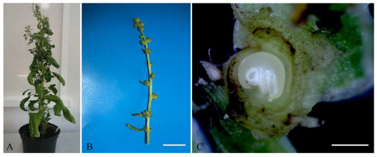 The appearance of sugar beet plants b.a. 37130: (A) a donor sugar beet plant grown in an environmental chamber; (B) a spike-like inflorescence of sugar beet with buds containing ovules for induction of gynogenesis in vitro, scale bar = 1 cm; (C) a comma-shaped sugar beet ovule in a bud suitable for induction of gynogenesis, scale bar = 1 mm.