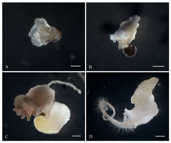 Variants of gynogenic development from induced beet ovules in vitro: (A) formation of callus structures; (B) simultaneous development of callus and embryo-like structures from one induced ovule; (C) polyembryony; (D) formation of white embryoids. Scale bars = 1000 µm.