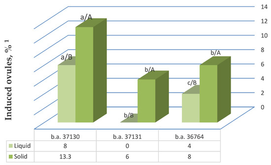 The use of liquid induction medium was less effective in all genotypes and resulted in a decrease in the yield of responsive ovules in the most responsive genotypes—b.a. 37130 by a factor of 1.7 and genotype b.a. 36764 by a factor of 2—and it led to the complete absence of induction of gynogenesis in b.a. 37131. The observed differences in the stimulating effect of liquid and solid nutrient media on the yield of responsive ovules were statistically significant in all genotypes. A two-factor ANOVA confirmed a significant effect of the gelling agent addition, as well as genotype on the induction of gynogenesis in vitro. The influence of nutrient medium type and genotype was 34.5% and 52.7%, respectively.