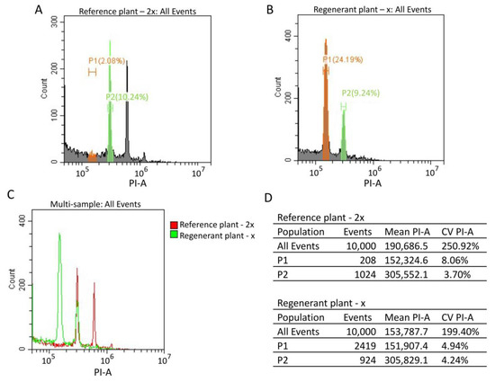 For cytometric ploidy evaluation, we chopped reference and regenerant plants in lysis buffer with a razor blade. Then, we filtered nuclei and stained them with PI. We generated reference standard and regenerant histograms (Figure 7A,B). The overlay of the reference standard and regenerant histograms showed that the regenerant G2 peak overlays with the reference G0/G1 peak (Figure 7C). The regenerant G0/G1 peak mean value is two times smaller than the control G0/G1 peak mean value (mean (P2control)/mean (P1regenerant) = 2.01) (Figure 7D). These results demonstrate that the regenerant is a haploid plant (2n = x = 9). Similar results were observed for all regenerant plants.