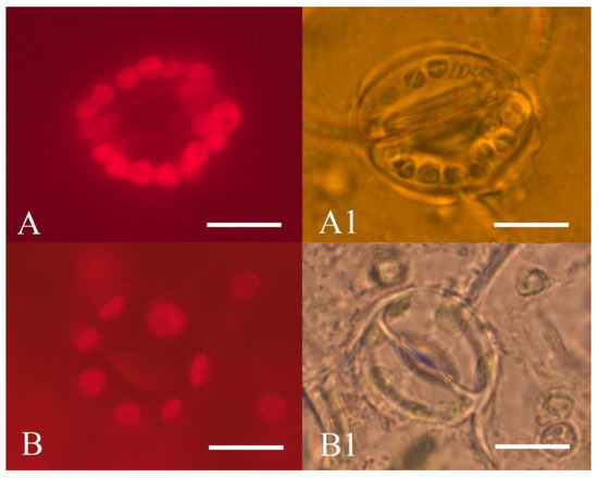 Epidermis of abaxial leaf surface of sugar beet plants: (A,A1)—diploid plant (2n = 2x = 18); (B,B1)—haploid regenerant plant (2n = 1x = 9), obtained in an unpollinated ovule culture in vitro; (A,B)—chloroplast autofluorescence of sugar beet stomata guard cells (680 nm); (A1,B1)—sugar beet stomata guard cells. Scale bars = 10 µm.