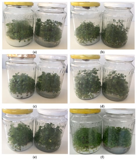 In vitro cultures of blackberry, cultivated on MS medium supplemented with 0.5 mg dm−3 BA, gelled with 5% wheat starch (left-sided jar) and 0.5% plant agar (right-sided jar): (a) ‘Chester Thornless’; (b) ‘Čačanska Bestrna’; (c) ‘Loch Ness’; (d) ‘Polar’; (e) ‘Driscoll’s Victoria’; and (f) ‘Karaka Black’.