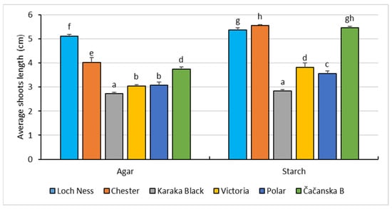 Shoot length of the in vitro blackberry cultivars ‘Čačanska Bestrna’, ‘Chester Thornless’, ‘Driscoll’s Victoria’, ‘Loch Ness’, ‘Polar’, and ‘Karaka Black’ grown on MS medium supplemented with 0.5 mg dm−3 BA, gelled with 0.5% plant agar (agar), and 5% wheat starch (starch). Different lowercase letters above the bars indicate significant differences between the means of the proliferation rate among cultivars, according to Duncan’s test (α < 0.05).