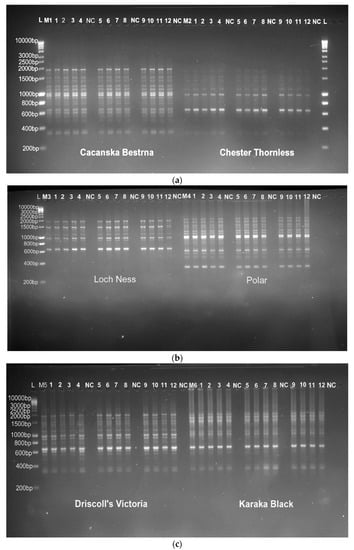 The monomorphic SRAP profiles of mother plants (M1–M6) from each of the six Rubus fruticosus L. cultivars and their in vitro proliferated shoots (1–12) generated by the primer combination Me4-Em5; (a) ‘Čačanska Bestrna’, ‘Chester Thornless’; (b) ‘Loch Ness’, ‘Polar’; (c) ‘Driscoll’s Victoria’, ‘Karaka Black’. Lane L—indicates the molecular marker (100 bp Ladder, Promega, USA); NC—sample controls without DNA.