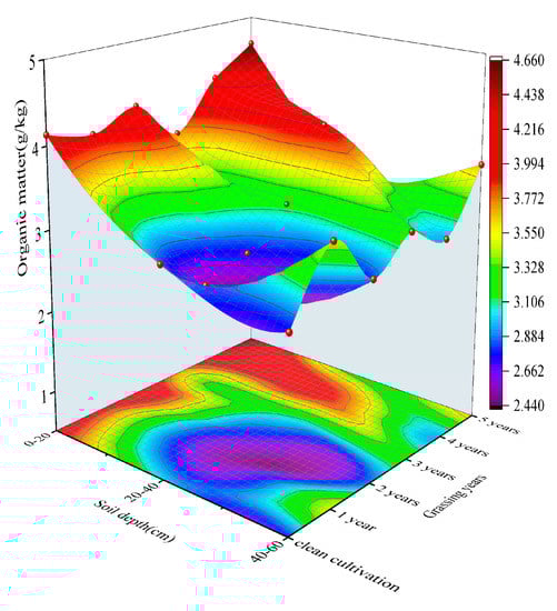 3.1.1. Effects of Grassing Years on Soil Organic Matter Content in Pear Orchards