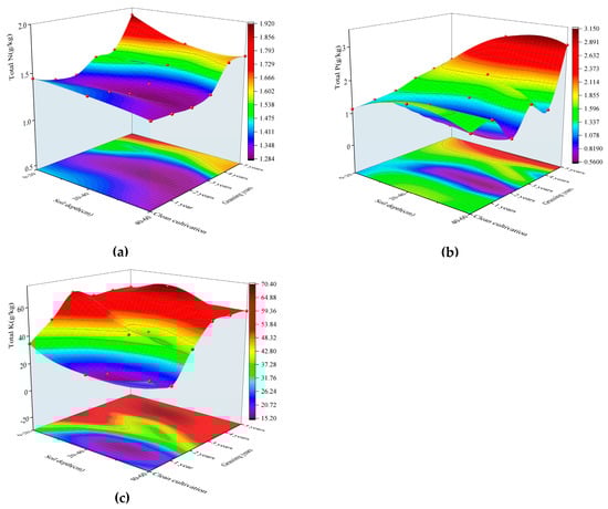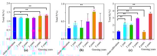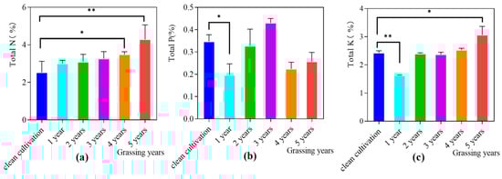 3.1.2. Effects of Natural Grass Cultivation Years on Soil Total Nitrogen, Phosphorus, and Potassium Contents in Pear Orchards