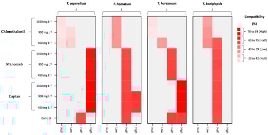 - Elshahawy, I.E.; Haggag, K.H.E.; Abd-El-Khaira, H. Compatibility of Trichoderma spp. with seven chemical fungicides used in the control of soil borne plant pathogens. Res. J. Pharm. Biol. Chem. Sci. 2016, 7, 1772–1785. [Google Scholar]
