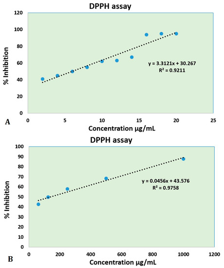 The scavenging free radical efficiency was evaluated using the technique from Shimada et al. [32]. A total of 100 mL of methanol was used to dissolve 3.94 mg of DPPH. A 100 µL methanol mixture was gradually added to 6 mL of each extract concentration from 62.5 to 1000 µg/mL. The mixture was stirred at room temperature for 30 min. Each absorbance value (AV) was recorded at 517 nm. The DPPH reduction efficiency was calculated according to the formula DPPH% = [(Dp − Dh)/Dp] × 100, where Dh represents the sample AV and Dp represents the control AV, which includes all necessary reagents except for the test sample. The activity was determined by comparing the IC50 (50% DPPH scavenging) value of the sample with that of butylated hydroxytoluene (BHT) [63].