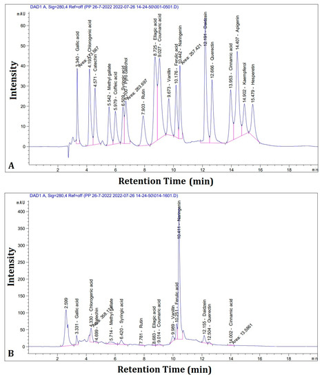 Phenolic and flavonoid standard compounds derived from HPLC instrument (A), and the polyphenolic content chromatograms detected in silk floss stem bark extract (B).