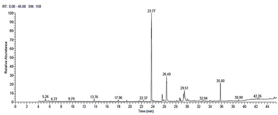 The silk floss tree stem bark extract was analyzed using gas chromatography–mass spectrometry (GC-MS), and the results from Figure 5 and Table 6 revealed the presence of several compounds. Among them was cyclohexene, 1-methyl-5-(1-methylethenyl)-, (R)-, classified as a terpenoid with a relative abundance of 1.29%. Benzoic acid 2-(methylamino)-methyl ester, a benzoic acid derivative, was also identified, accounting for 1.32% of the extract. Additionally, 1,2-benzenedicarboxylic acid, diethyl ester, a phthalate ester, was detected at a relative abundance of 0.73%. Terpenoids are known for their antimicrobial activity and have been reported to be effective against a range of microorganisms [104].