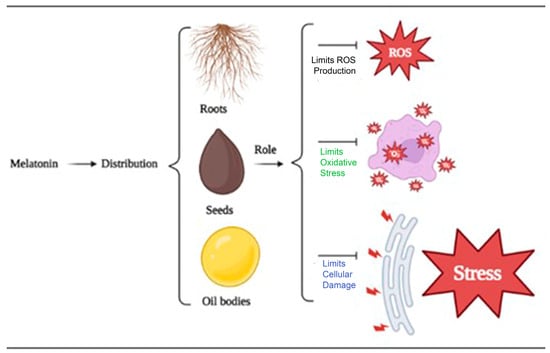 - Posmyk, M.M.; Bałabusta, M.; Wieczorek, M.; Sliwinska, E.; Janas, K.M. Melatonin Applied to Cucumber (Cucumis sativus L.) Seeds Improves Germination during Chilling Stress. J. Pineal Res. 2009, 46, 214–223. [Google Scholar] [CrossRef] [PubMed]