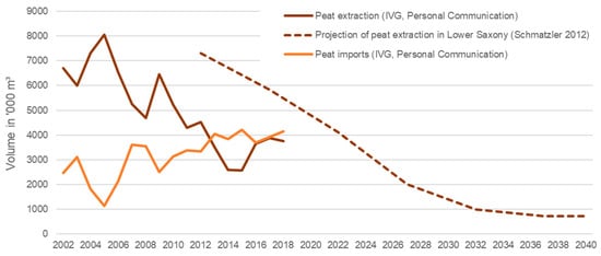 The process of extracting and using horticultural peat from peatland soils is a significant source of greenhouse gas (GHG) emissions that accounts for about 12.6 Mt CO2-eq for the European Union (Convention) and 2.2 Mt CO2-eq for Germany (Data 2019, [1]). Peat extraction only represents a small share of the total GHG emissions from peatlands but generates, through the fast destruction of the soil carbon stock, by far the highest climate impact per hectare compared with any other human activity on peatlands. The climate footprint of peat is also by far the highest among all other horticultural growing media constituents [2,3]. Moreover, peat extraction potentially represents a threat to ecosystems in regions where the extraction takes place on living mires and without renaturing measures afterwards [4]. In Europe, Germany ranks first for the extraction of peat for horticultural purposes, second for peat imports, first for the use of peat in growing media production, first for exports of peat and peat products and first for the use of peat in horticulture [5]. As presented in Figure 1, Schmatzler [6] forecasted an almost complete end to peat extraction in 2040 in Lower Saxony, where German peat extraction is concentrated [7]. The reasons behind this trend are the limitation of land availability through competition with agriculture and restrictions on the issuance of new extracting permits. Despite important uncertainties concerning data on German peat extraction [5], a long-term trend of decrease in the amount of domestically extracted peat can be observed, compensated by increasing imports from other EU states, especially the Baltic states.