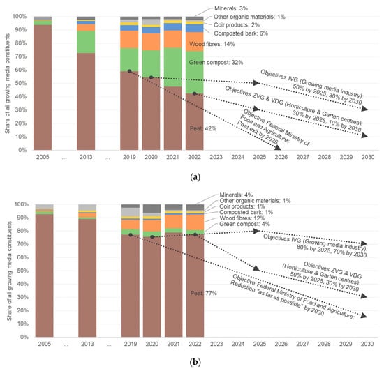 Evolution of the composition of growing media in Germany in (a) the hobby sector and (b) the professional sector and peat use reduction objectives set by stakeholders. For the years 2005 and 2013: total growing media production in Germany (source: [31,35]). For the years 2019–2022: growing media production in Germany for the domestic market (source: [33]). Objectives apply for growing media used in Germany. The curve starts at the year of decision.