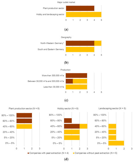 Number of surveyed companies (N = 9) depending on (a) major outlet market of growing media, (b) geographical location of the majority of the production sites (* Lower Saxony, Schleswig-Holstein, Bremen, Hamburg, Nord Rhine-Westphalia), (c) yearly volume of growing media production and (d) peat rate and outlet market of produced growing media.