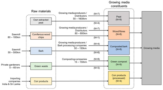 Supply chains of raw materials and growing media constituents in the companies surveyed (N = 9).