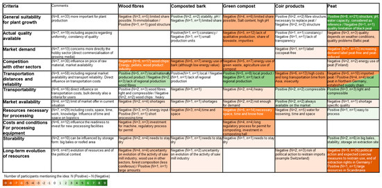 Assessment of growing media constituents based on the interview data and using the critical criteria identified.