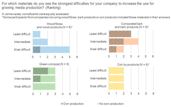 At the end of the interviews, the interviewees were systematically asked to rank constituents depending on the difficulties associated with the increase in their use. The results are presented in Figure 6. Wood fibre was generally assessed more critical than other peat substitutes, but the answers do not permit us to establish a general ranking for the constituents. For composted bark and green compost, the fact that the company processes the product seems to be linked to a less critical assessment of the situation. This can be interpreted as a confirmation of the advantages provided by processing. The opinion on coir products was notably split between interviewees, with some mentioning its great potential for peat substitution and the good market availability (N = 2) and others not considering it viable based on the long transportation distances and ecological and social considerations (N = 3).