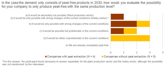When asked about the difficulty of the transformation of the companies towards peat-free growing media production in 2030 as presented in Figure 7, the vast majority estimated that a complete replacement of peat was possible (N = 8); however, for some of them, only under strong changes to the current conditions (N = 3). The answers were polarised depending on the presence of peat extraction. The higher difficulty mentioned by companies with peat extraction facilities can be interpreted as the specialisation of their infrastructure and supply on peat and their focus on the professional sector.