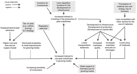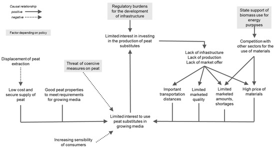 In the following paragraphs, we propose a causal chain explaining the limitation of the transformation of the resource base towards peat substitutes for the production of growing media. This causal chain is illustrated in Figure 8. This interpretation enables us to redefine the “availability problem” as the limit of the amounts of material on the market of sufficient quality, at a reasonable price and within a transportation radius allowing the growing media producers to competitively produce growing media. The amounts and quality of constituents available on the market as well as the transportation distances necessary to source these amounts are directly linked to the development of the processing infrastructure and the attention of the suppliers to the requirements of the growing media production. Additionally, the price and the market availability of the material is affected by competition with other sectors, itself exacerbated by state subsidies for the energy use of biomass. In the current situation, these aspects limit the economic interest in using more peat substitutes, which itself limits the interest of suppliers or growing media producers for producing these constituents and developing the corresponding infrastructure. In addition, regulatory burdens can slow down, disincentivise or prevent the development of new processing facilities and additional storage space.
