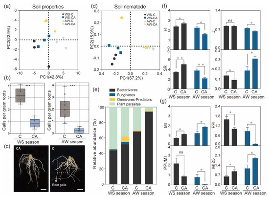 Intercropping changed the cucumber root-zone soil nematode community and decreased the RKNs disease. C: Cucumber monocropping; CA: Cucumber-amaranth intercropping; WS: Winter-spring season; AW: Autumn-winter season. (a) Soil chemical and ionome profiles analyzed by PCA. (b) Numbers of cucumber root galls in monocropping (C) and intercropping system (CA) in two growing seasons. p-values calculated using Student’ t-test, *** p < 0.001, n = 5. (c) Representative pictures of cucumber root planted in monocropping (C) and intercropping (CA) system, bar: 2 cm. (d) Partial Canonical analysis of soil nematode community. (e) Distribution of soil nematodes by trophic groups. (f) The diversity indices of soil nematode community. p-values calculated using Student’s t-test, * p < 0.05, ** p < 0.01, ns: not significant, n = 3. (g) The maturity indices of soil nematode community. p-values calculated using Student’s t-test, * p < 0.05, n = 3.