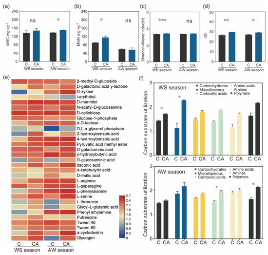 The community level physiological profiling (CLPP) of cucumber root-zone soil. C: Cucumber monocropping; CA: Cucumber-amaranth intercropping; WS: Winter-spring season; AW: Autumn-winter season. Soil microbial biomass carbon (a) and nitrogen (b) of cucumber root-zone soil in two growing seasons. MBC, microbial biomass carbon; MBN, microbial biomass nitrogen. (c) The Shannon-Weiner index and (d) the reciprocal of Simpson’s index (1/D) of cucumber monocropping and intercropping system. (e) Heatmap showed the OD values of various 31 substrates. The observations of OD values at the 96 hr incubation points were used for drawing heatmaps. (f) The carbon substrates are grouped into six major carbon categories and we evaluated the carbon substrate utilization by OD values. p-values calculated using Student’ t-test, * p < 0.05, ** p < 0.01, *** p < 0.001, ns: not significant, n = 3.