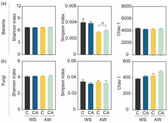 The α-diversity of cucumber root-zone soil community. C: Cucumber monocropping; CA: Cucumber-amaranth intercropping; WS: Winter-spring season; AW: Autumn-winter season. (a) Shannon, Simpson and Chao 1 index of bacterial community. (b) Shannon, Simpson and Chao 1 index of fungi community. p-values calculated using Student’ t-test, * p < 0.05, n = 3.
