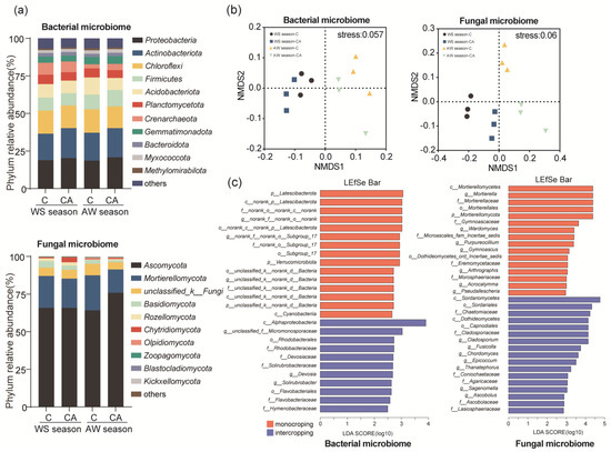 Intercropping system shaped cucumber root-zone soil microbial community structure. C: Cucumber monocropping; CA: Cucumber-amaranth intercropping; WS: Winter-spring season; AW: Autumn-winter season. (a) Microbial composition in root-zone soil displayed as stacked bar plot at phylum level of bacterial and fungal community. (b) Non-metric multidimensional scaling (NMDS) based on Bray-Curtis dissimilarity displaying bacterial and fungal community. (c) The linear discriminant analysis (LDA) scores to identify the intercropping system shaped taxa at the phylum (p) and genus (g) levels, detected by the LDA of effect size (LEfSe) analysis. Only taxa with the absolute LDA score > 2.5 are shown.
