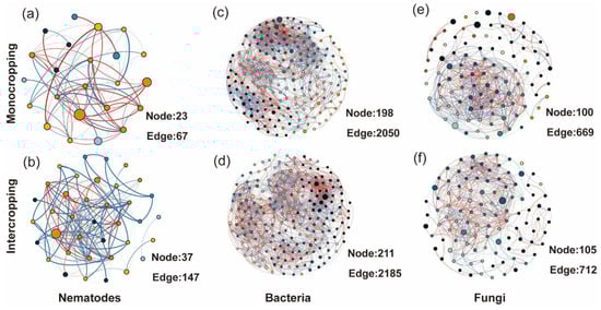 The resulting soil nematode network consisted of 23 nodes and 67 edges (Figure 5a) in the cucumber monocropping system, but an increase appeared in intercropping soils which consisted of 37 nodes and 147 edges (Figure 5b). For the microbial network of cucumber root-zone soil, we generated four networks for bacteria and fungi under monocropping and intercropping systems. Collectedly, the introduction of amaranth in the cucumber intercropping system slightly improves the complexity of the soil microbial community (Figure 5c–f).