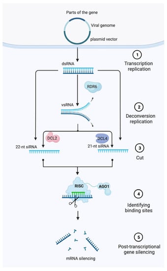 In plants, traditional gene functional verification relies on genetic transformation technology, and most of the genetic transformations of various species are unstable. Therefore, virus-induced gene silencing technology is suitable for plant functional genomics research [1,78]. VIGS offers a fast substitute to knock down genes of interest by sequence-specific RNA degradation processes [79]. After infecting plants, viruses produce double-stranded RNA (dsRNA) with a length of 21 to 30 nucleotides during virus replication in the cytoplasm of plant cells, which is processed into siRNA by DCL (DCL2/3/4). The loading siRNA is incorporated into different RISC complexes described in the model, including RNA-induced transcriptional gene silencing complex (RITS). It directs chromatin methylation and siRNA/miRNA-dependent RNA-induced silencing complexes, leading to the transcription of target mRNAs, along with cleavage and translation arrest. For virus-encoded RNA-dependent RNA polymerase (RdRP), secondary siRNAs are produced in the amplification loop by RDR and its cofactors (FX, SGS3, etc.) [80].
