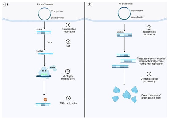 Models of virus-induced transcriptional gene silencing system and virus-induced gene overexpression. (a) For VITGS, the RNA-mediated transcriptional gene silencing (TGS) can be utilized to target the gene promoter in DNA through small RNAs, which resulted in DNA methylation of specific targeted promoter sites. (b) For VIGO, the gene of interest must contain a full-length mRNA sequence (with start and stop codons) and be placed downstream of a promoter and upstream from a terminator sequence. Alternatively, protease cleavage sites can be incorporated on either side of the coding sequence to ensure excision of a functional protein from the viral genome during replication.