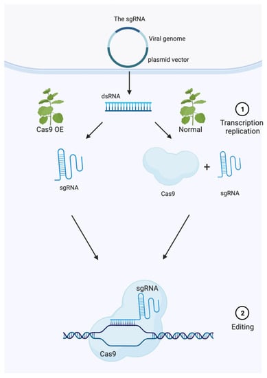 Model of Virus-Induced Genome Editing. VIGE vectors can be classified into two categories according to their cargo capacity and the reagents that may be delivered. The first category includes VIGE vectors that express a sgRNA and infected plants that stably express Cas9. Viral vectors could efficiently deliver sgRNAs into plant cells to enable the editing of target genes. The second category includes VIGE vectors that deliver both Cas9 and sgRNA, which spread systemically in plants.