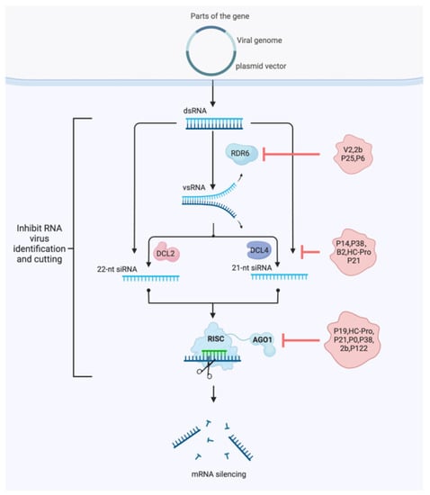 VSRs have been found to boost the efficiency of VIGS by temporarily inhibiting the RNA silencing machine of host plants, facilitating the transmission of RNA viruses in plants (Figure 4) [81]. Furthermore, VSR genes may develop independently in each virus family as viruses continue to adapt to host RNA silencing immunity [33]. They are surprisingly diverse both within and between populations, with no apparent sequence homology. The VSR protein encoded by many viruses interacts with effectors that block RNA silencing pathways [82,83], such as DICER, dsRNA, siRNA, RNA-induced silencing complex (RISC), or systemic signals [33,84,85].