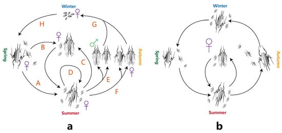 Common Aphid life history [9,17,18]. “♀” means females and “♂” means males. (a) Holocycle. (A) Generally, wingless female aphids reproduce through parthenogenesis, producing larvae in spring. (B) In the case of heteroecious aphids, winged female aphids are produced so that they can migrate to summer host plants at the end of spring. In summer, wingless females generate various larval types depending on environmental conditions: (C) when the host plant becomes unsuitable for aphid reproduction, winged females emerge to migrate to appropriate host plants for parthenogenesis; (D) when the host conditions and environment are favorable, wingless females continue parthenogenesis. Aphids alter their reproductive mode in response to impending seasonal changes which result in temperatures unfavorable for their survival. (E,F) As autumn approaches, wingless female aphids produce both male and female larvae. In general, antoecious aphids are wingless. In the case of heteroecious aphids, winged female and winged male aphids migrate to winter host plants. (G) Adult males and females engage in sexual reproduction through mating, generating eggs to withstand the harsh winter conditions. (H) In the subsequent spring, the eggs hatch into wingless female aphids, initiating a new reproductive cycle. (b) Anholocycle. Throughout its life history, no male aphids occur, and female aphids reproduce through parthenogenesis all over the year. When aphid population densities become too high, winged aphids are produced that migrate and spread between host plants.