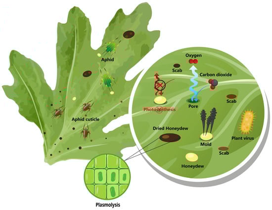 Honeydew secreted by aphids can block chrysanthemum leaf pores and negatively impact the plant’s photosynthesis [5]. As honeydew dries, its sugars produce a high osmotic pressure concentration, leading to the separation of plant leaf cell mass walls, making them thinner and more susceptible to pathogens. Additionally, honeydew can create a suitable environment for black molds, causing spots on chrysanthemum leaves. The aphid cuticle can also remain on the plant’s surface, affecting the plant’s ornamental value (Figure 3) [7].