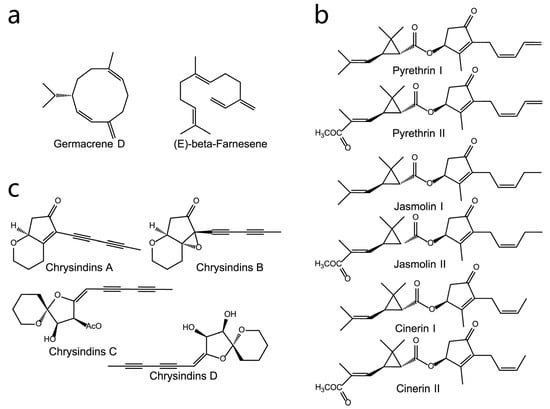 (a) Chemical structure formulae of germacrene D and (E)-β-farnesene, (b) Chemical structure formulae of pyrethrin I, pyrethrin II, cinerin I, cinerin II, jasmolin I, and jasmolin II; (c) Chemical structure formulae of chrysindins A-D.