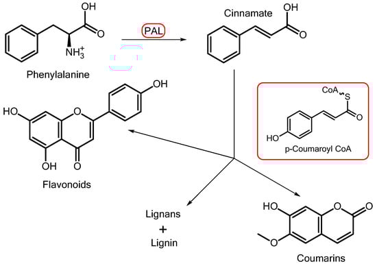 Phenylalanine ammonia lyase (PAL) synthesizes numerous compound precursors, cinnamic acid, and p-coumaroyl CoA catalyzes synthesis of physiologically important compounds.