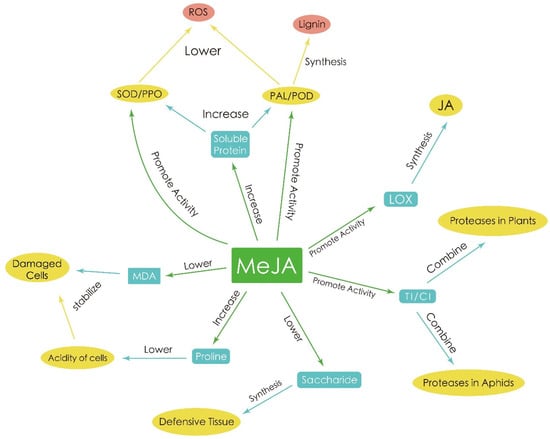 The pathways of methyl jasmonate for aphid resistance. MeJA, methyl jasmonate; MDA, malondialdehyde; LOX, lipoxygenase; TI, trypsin proteinase inhibitor; CI, chymotrypsin proteinase inhibitor; JA, jasmonic acid; PAL, phenylalanine ammonia lyase; POD, peroxidase; PPO, Polyphenol oxidase; SOD, superoxide dismutase; ROS, reactive oxygen species.