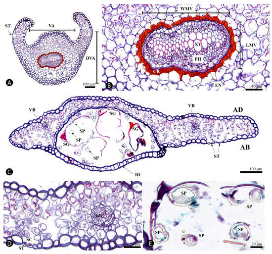 Micrographs of transverse section of the stipe and fertile frond in the Davallia mariesii. (A,B) Stipe. (C) Fertile frond. (D) Blade of fertile frond. (E) Sporangium with spore. AB, Abaxial side; AD, Adaxial side; CB, circumendodermal band; DVA, length of dorsiventral axis; EN, endodermis; ID, Indusium; LMV, length of main vascular bundle; PH, phloem; SC, stomata chamber; SG, Sporangium; SP, spore; ST, stomata; VA, length of ventral axis; VB, vascular bundle; WMV, width of main vascular bundle; XY, xylem.
