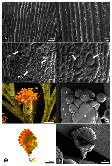 Stereo (SM), light (LM), and scanning electron (SEM) micrographs of the mature sporophyte in the Davallia mariesii. (A,B) Adaxial side of a fertile frond. (C,D) Abaxial side of a fertile frond with stomata. (E,F) Sorus with indusium. (G,H) Sporangium with spore. (A–D,F,H) SEM. (E) SM. (G) LM. AB, Abaxial side; ANI, Anisocytic, DIA, Diacytic; ID, Indusium; SG, Sporangium; ST, stomata; TET, Tetracytic.