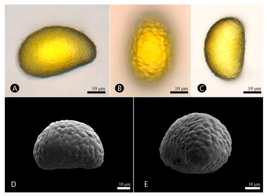 The spores were free and their sizes were 34.3–(38.8)–42.2 μm in polar axes, and 39.3–(50.8)–55.0 μm in equatorial axes. The exine was measured to be 2.3–(3.4)–5.1 μm thick (Table 4). The outline of the spore was transversely elliptical–reniform to ellipsoidal, bilaterally symmetrical, aniso-polar, and rounded–elliptical in polar view. The aperture was a monolete, which was a single linear mark designating the dividing axis of the proximal face (Figure 4). The ornamentation was a verrucae–colliculate type; the verrucae were numerous, slightly convex, densely packed, rounded, 2–(3.2)–5 μm diameter with radiating from laesura, forming a polygonal reticulate pattern (Figure 4D,E).