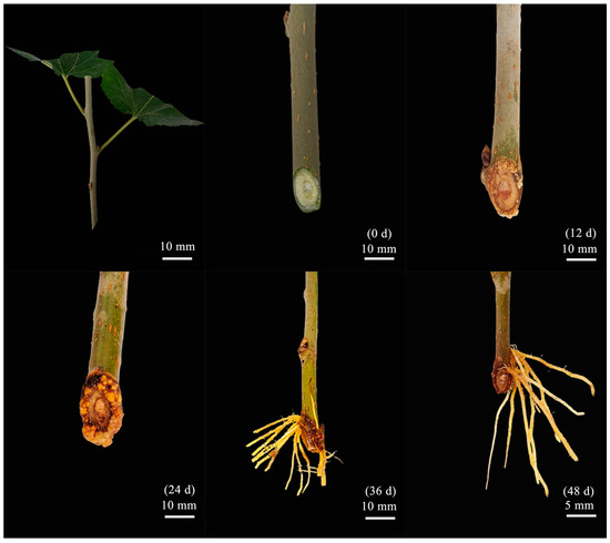 Following the cutting procedure, at intervals of 4 days, 2–3 cuttings were carefully extracted to capture photographic documentation of their root morphological transformations, thereby documenting the progression of rooting. Concurrently, a sampling investigation was conducted, facilitating the statistical analysis of adventitious root emergence and development. After a 48-day period of cutting, the complete root system of each plant was extracted from the substrate and meticulously cleansed to eliminate any extraneous matter. Subsequently, the number of roots, the length of each root, and the rooting rate were meticulously tallied, with root length measurements precise to 0.01 cm.