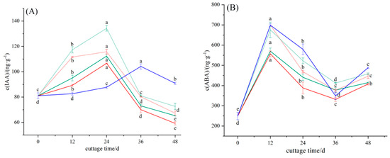 Figure 2A shows that the IAA content of the cuttings subjected to ABT1 treatment and the control group exhibited a ”rise–fall” pattern. In the treatment group, the IAA increased rapidly from the day of cutting and reached its peak on the 24th day, followed by a rapid decrease. Among the treatment groups, the cuttings treated with 800 mg/L ABT1 displayed the highest IAA content (134.27 ng·g−1). This indicates that the IAA content increased from the initial cutting stage until the formation of root primordia during callus differentiation, significantly decreased during the formation of adventitious roots, and decreased further during the formation and elongation of a substantial number of adventitious roots. This trend exhibited a stable pattern of change. In the control group, the IAA content increased gradually and reached its peak on the 36th day, which was 12 days later than that of the treatment group. These results suggest that a lower level of endogenous IAA is conducive to promoting the growth of adventitious roots. Previous studies have highlighted the requirement for higher levels of endogenous IAA to induce the formation of root primordia during adventitious root development. However, the IAA content decreased during the growth and differentiation of root primordia, indicating a correlation between an increased IAA content and the formation and occurrence of adventitious roots [14,15,16]. This experiment supports the same observation, affirming that IAA serves as a crucial endogenous hormone in the induction of adventitious root formation in mulberry cuttings.