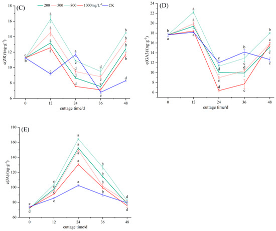 Effects of different concentrations of ABT1 treatment on the changes in endogenous hormones in the base of mulberry cuttings. (A) IAA content, (B) ABA content, (C) ZR content, (D) GA3 content, (E) JA content. The data show the mean + standard deviation of the three repeated samples, and the difference between different lowercase letters was significant (p < 0.05).