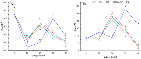 Effects of different concentrations of ABT1 treatment on the ratio of endogenous hormones in the phloem of mulberry cuttings. (A) shows the variation trend of the IAA to ABA mass fraction ratio of cuttings in the ABT1 treatment group compared to the water treatment group; (B) shows the trend of changes in the IAA to ZR mass fraction ratio of cuttings in the ABT1 treatment group compared to the water treatment group. The data show the mean + standard deviation of the three repeated samples. There was a significant difference between different lowercase letters (p < 0.05).