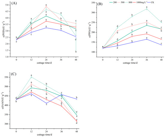 Effects of different concentrations of ABT1 treatment on phloem oxidase activity of mulberry cuttings. (A) represents the changes in POD activity during mulberry cutting rooting, (B) represents the changes in PPO activity during mulberry cutting rooting, and (C) represents the changes in IAAO activity during mulberry cutting rooting. The data show the mean + standard deviation of the three repeated samples. There was a significant difference between different lowercase letters (p < 0.05).