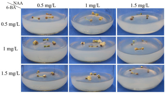 We further compared the performance of using stem segments and hypocotyls as explants on embryogenic callus induction. The hypocotyls were from pomegranate seedlings that germinated and grew for 7 days. All the explants were inoculated onto MS medium supplemented with 1.0 mg/L NAA and 0.5 mg/L 6-BA, according to the screening results (detailed in Section 3.2). For each type of explant, the experiments were repeated 105 times, with explants inoculated on 15 Petri dishes and each dish containing 7 replicates. The embryogenic callus induction rate was then calculated by the equation described above. The difference in induction of embryogenic calli between the two types of explants was evaluated by one-way ANOVA in SPSS software.