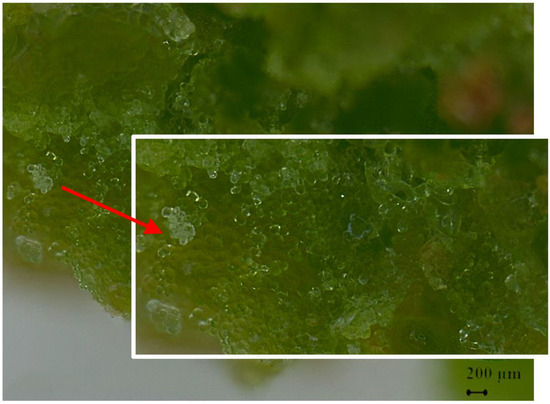 Pomegranate embryogenic calli induced using medium B2 (see Table 2 for details). Red arrow points to a magnified shot of the induced embryogenic calli.