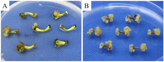 Pomegranate embryogenic calli induced by hypocotyl (A) and stem explants (B).