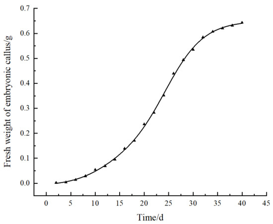 We also examined the impacts of the different subculture cycles on the proliferation of embryogenic calli. Well-grown embryogenic calli were selected and inoculated on MS medium with 0.5 mg/L 6-BA and 1.0 mg/L NAA to produce new embryogenic calli. The embryogenic calli were weighed immediately after inoculation to serve as the fresh weight of the initial calli and were then weighed and recorded every 2 days until the fresh weight no longer increased. Origin 2021 (OriginLab Corp., Northampton, MA, USA) was used to fit the growth curve.