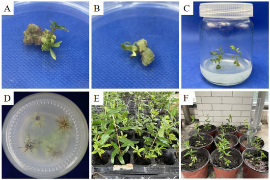 Somatic embryo seedlings of pomegranate. (A,B) Mature somatic embryos with buds. (C) Somatic embryo seedlings inoculated onto rooting medium. (D) Roots of somatic embryo seedlings in culture medium. (E,F) Somatic embryo seedlings after seedling refinement and transplantation.